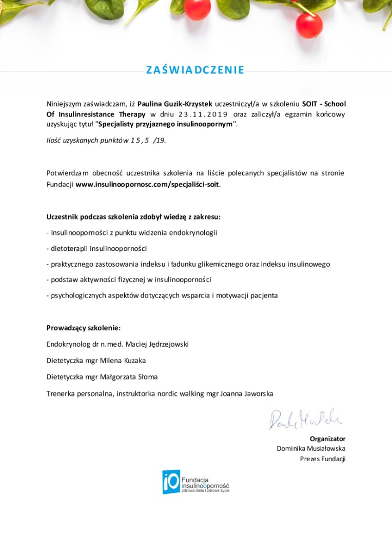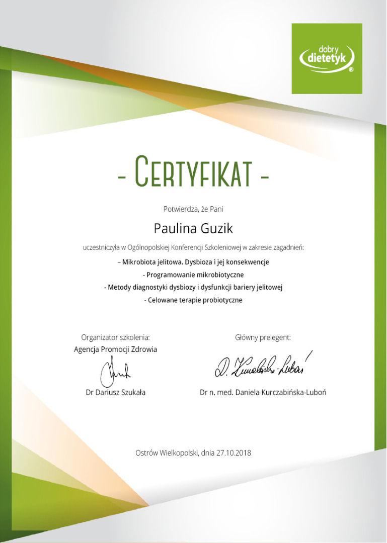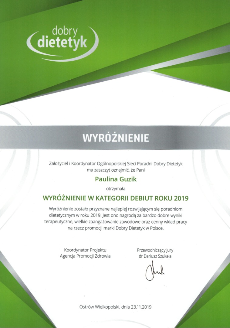 Dietetyka to moja Pasja. Ukończyłam studia na kierunku Dietetyka na Uniwersytecie Rolniczym w Krakowie, a także liczne kursy i szkolenia. Przez kilka lat prowadziłam trzy gabinety w sieci Dobry Dietetyk, teraz tworzę swoją markę Dietfly. Przygotowałam odpowiednią strategię zdrowego żywienia dla setek Pacjentów, stworzyłam też tysiące planów żywieniowych. To właśnie dzięki temu posiadam doświadczenie w najróżniejszych przypadkach - czy to dieta w chorobie, czy odchudzająca, czy dieta dla przyszłej mamy.